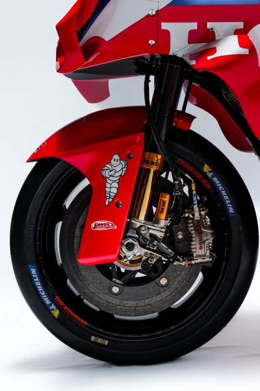 Carbon fiber front brakes are provided by Brembo. Monobloc finned aluminum GP4 Brembo calipers are machined from solid with a radial attachment of four titanium pistons. These are mounted on Double Brembo carbon brake discs on the front of the motorcycle. A Brembo aluminum rear caliper with steel brake disc is used on the back wheel. In both wet and dry conditions, external covers and cooling ducts are sometimes added to help regulate the temperature of the brakes as the demands of MotoGP machines continue to grow.
